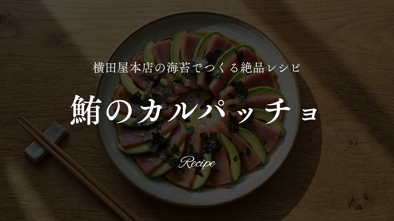 今回は、横田屋本店の人気商品「朝めしのり【旨しお】(10切 50枚)」を使って、さらに旨みたっぷりの一皿に仕上げます。パリッとした食感と、香ばしいごま油の風味と程よい塩加減で、魚介との相性が抜群。いつものカルパッチョが、料亭のような奥深い味わいに変わります。